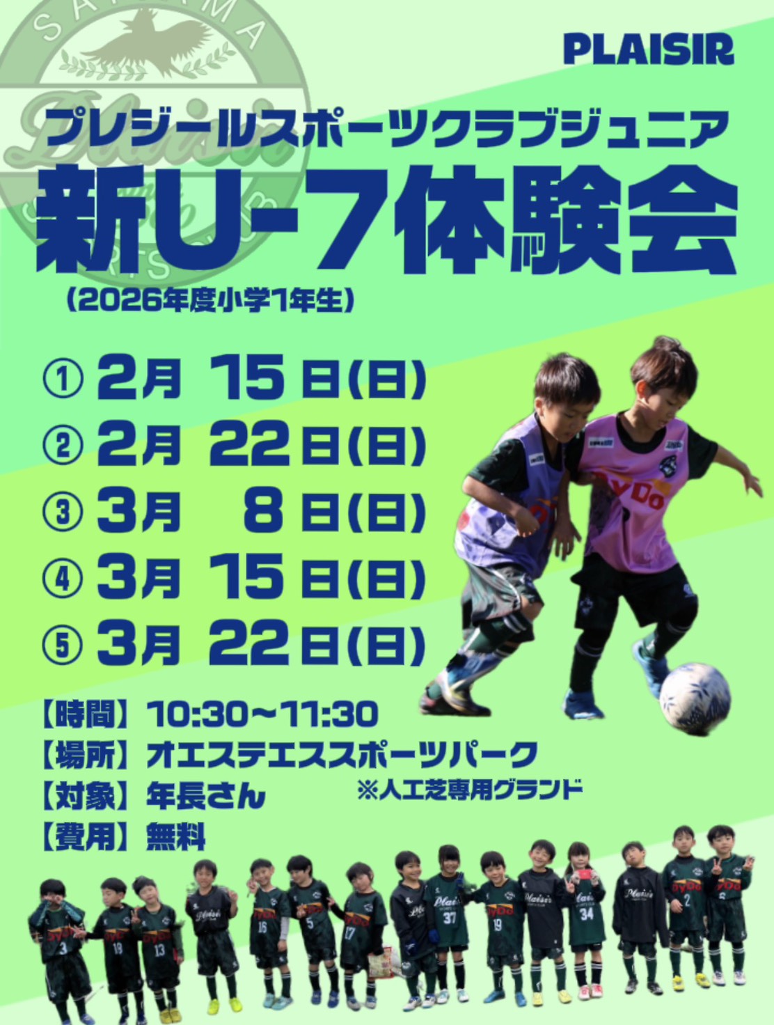 この度、プレジールスポーツクラブでは、2026年4月から小学1年生となる年長さんを対象に『新U-7体験会』を開催いたします。